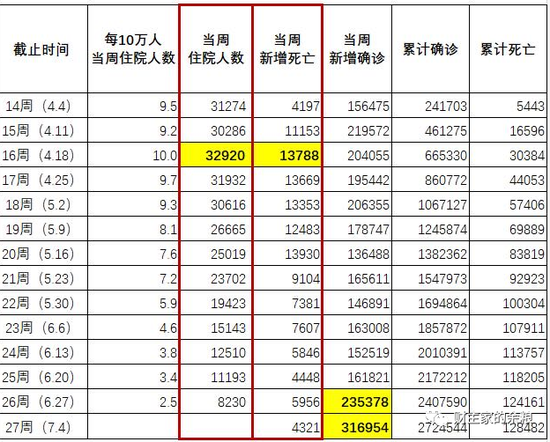 虽然确诊人数上看,仍然在一路上升,但美国整体疫情影响已在减轻,感染新冠病毒的住院人数和死亡人数已经明显开始下降,确诊人数增加,则是美国CDC将“Probable Case”纳入其中的原因,属于统计内容变更,与实际疫情演化无关(见下表)。