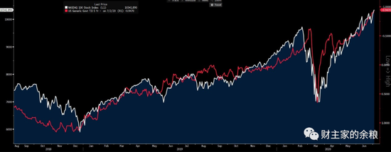 因为通货膨胀预期一直维持在很低的水平,所以国债收益率降低也意味着真实收益率降低,下面的这张图,是纳斯达克100指数(左纵轴)与美国5年期抗通胀债券收益率(右纵轴,注意收益率是上面低下面高)的对比情况,你是不是发现特别一致?
