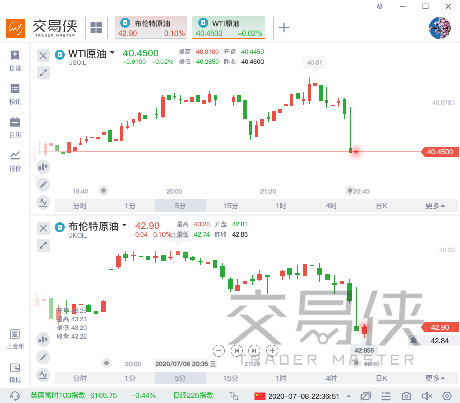数据公布后,两油短线下挫。NYMEX最活跃WTI原油主力期货合约北京时间7月8日22:30-22:32三分钟内买卖盘面瞬间成交6840手,交易合约总价值逾2.77亿美元。