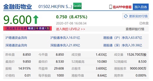 8日,金融街物业报收9.6港元/股,股价相比前个交易日上涨8.47%。