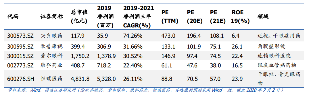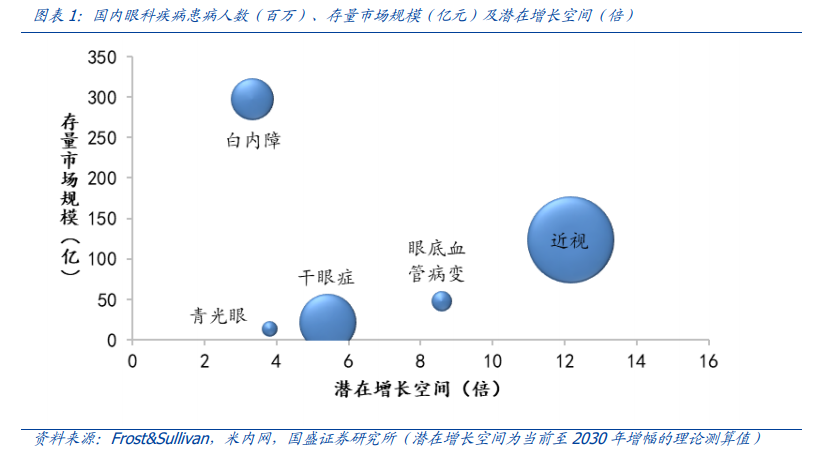 我国是全球眼病患者最多的国家,仅近视(约 7 亿),干眼症(约 3 亿),白内障(1.6亿)三大眼病患者人数就超过 10 亿(不考虑重叠发病)。随着老龄化加重、生活方式的改变和过度用眼增加、消费者健康意识的提升,近年来眼科疾病治疗需求不断增长,市场规模迅速扩大。近年来,眼科领域已经成为医药行业公认的黄金赛道,不断涌现如爱尔眼科、欧普康视等优秀企业。