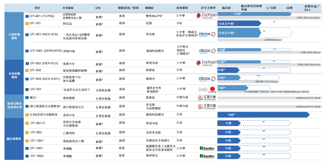 欧康维视产品线中有16种药物资产,涵盖眼睛前部及后部疾病,有四款创新药处于后期开发阶段。