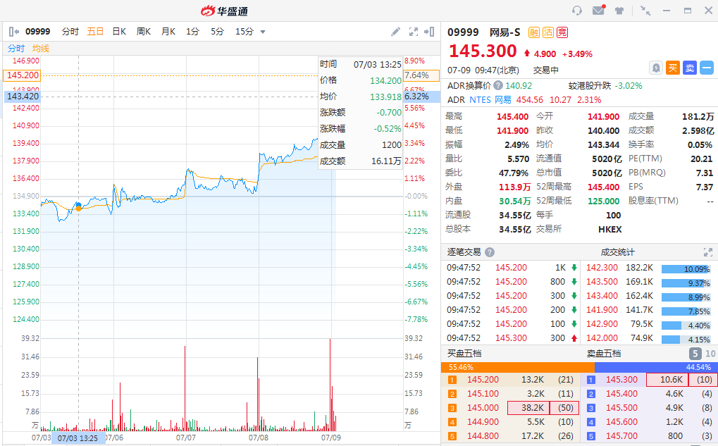 新浪港股讯 7月9日消息,网易拉升涨3.49%,报145.3港元,市值突破5000亿港元。