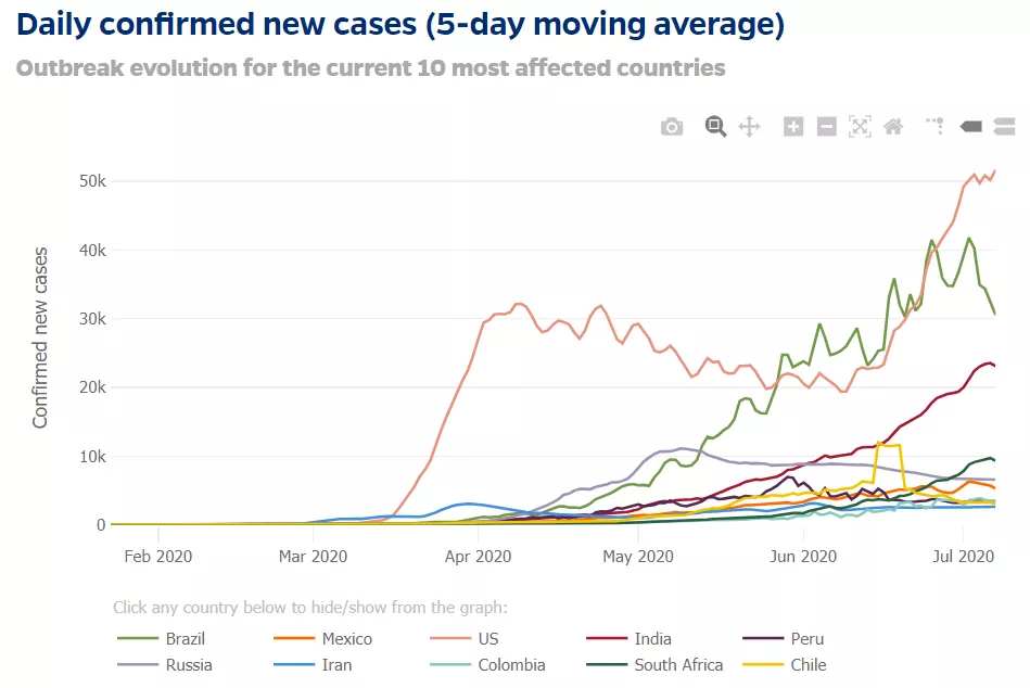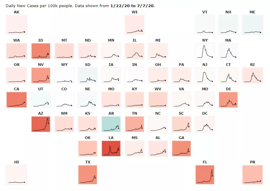 在地域分布上,疫情在美国西部和南部继续蔓延。最近几天,亚利桑那州、加州、佛州和德州占据了新增确诊的一半以上。