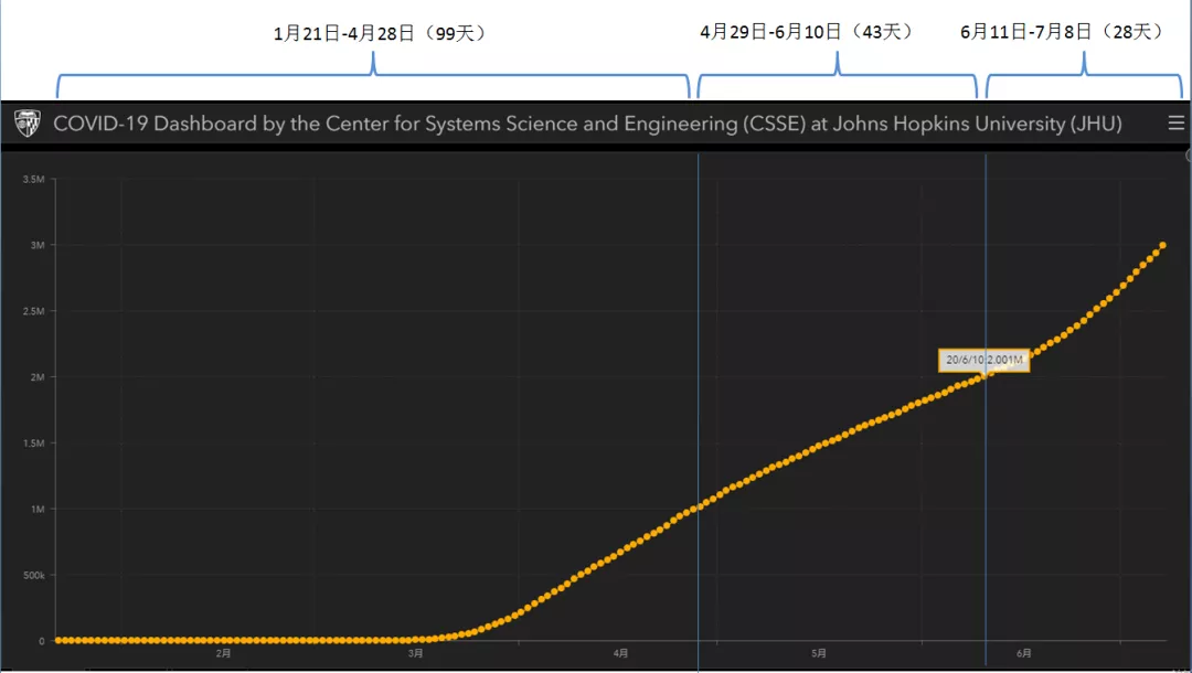 进入6月,以美国西部、南部各州为主的疫情呈现快速蔓延趋势,这也让美国新冠病例继续快速增加。随着每日新增病例数近日创下新高,7月8日美国总病例数突破300万,这也意味着第三个百万病例只用了28天的时间。