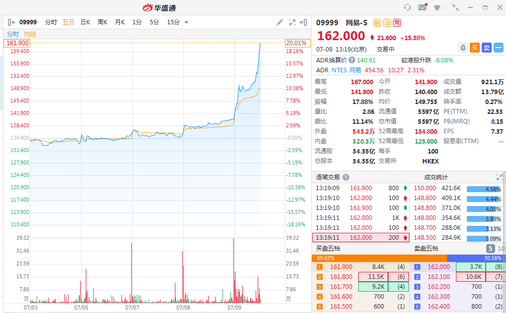 新浪港股讯 7月9日消息,网易午后涨幅继续扩大至15%,现报162港元,市值突破5500亿港元。