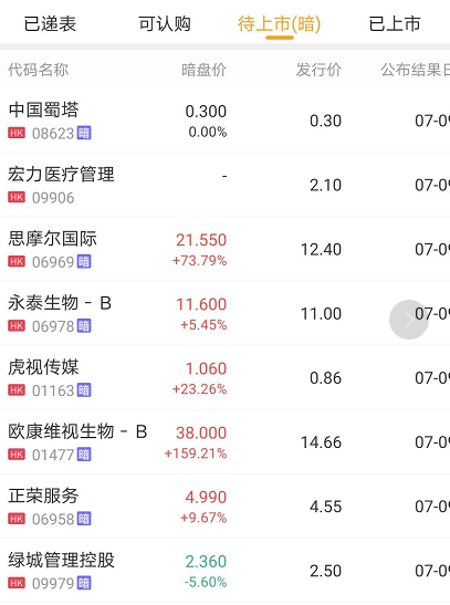 华盛资讯7月9日讯,7只新股暗盘交易开启,其中有5只新股开盘大涨,欧康维视生物-B暗盘领涨159%,一手赚11670港元。截至发稿,思摩尔国际大涨73.79%,虎视传媒涨23.26%,正荣服务涨9.67%,永泰生物-B涨5.45%。