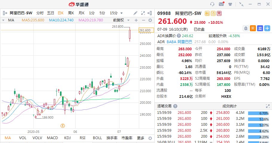 华盛资讯7月9日消息,今日大型互联网公司集体上涨,其中,阿里港股大涨超10%市值暴涨超5000亿港元,总市值再度超过腾讯,成为中国市值最高公司。