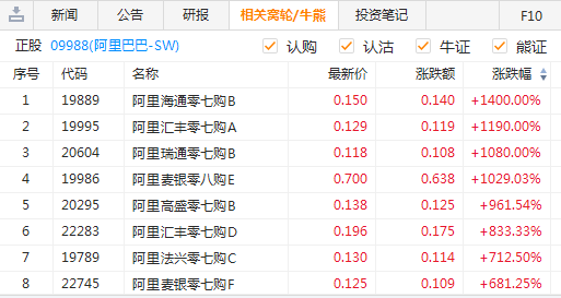 随着阿里股价喜提“涨停板”,其相关做多轮证也纷纷录得惊人涨幅!