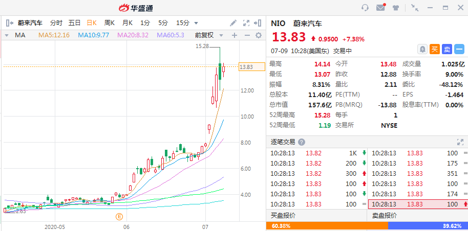 华盛资讯7月9日消息,蔚来汽车今日高开高走,截至北京时间22:28,涨7.38%,报13.83美元。