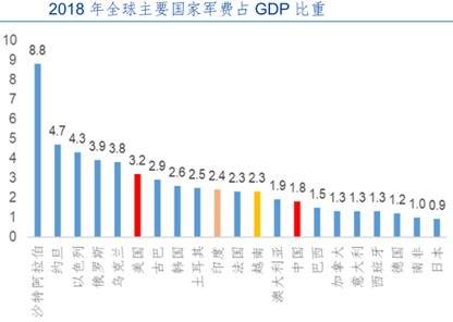 如果横向对比世界各国军费占GDP比重来看,我国军费占比依旧有较大提升空间。根据2018年世界银行的数据,与中国政治相关性较高的主要国家中除了日本的0.9%外,分别为3.2%、3.9%、2.4%、2.3%、2.6%的美国、俄罗斯、印度、越南、韩国军费占GDP比重,均高于中国的1.8%。整体而言,中国是有能力保证国防开支持续增长,并且在当前复杂的国际局势下,国防增速不会出现明显下滑,而且未来增速还有提升的空间和可能。