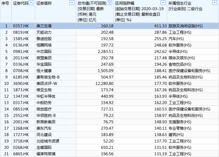 根据wind数据统计,从3月19日以来截至7月9日收市涨幅大于100%,市值超过50亿港元的港股数量达48只。