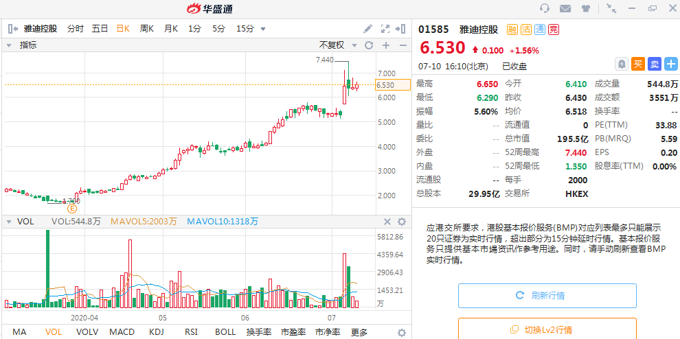 雅迪控股的暴涨与其亮眼业绩以及两轮电动车行业良好的前景有关。