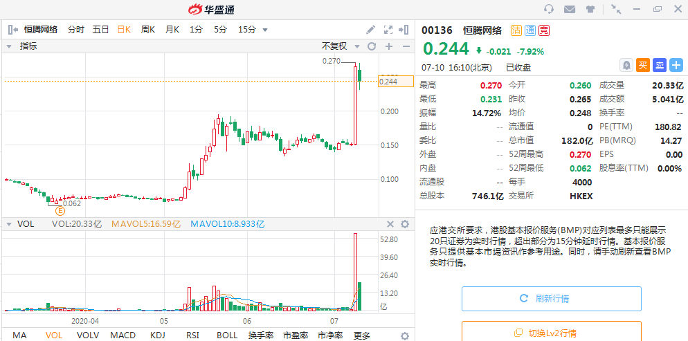 恒腾网络在暴涨后股价仅有0.244港元,在5月8日恒腾网络这波上涨前其收市价仅为0.074港元,因此这也是港股市场传统意义上的“仙股”、“细价股”。