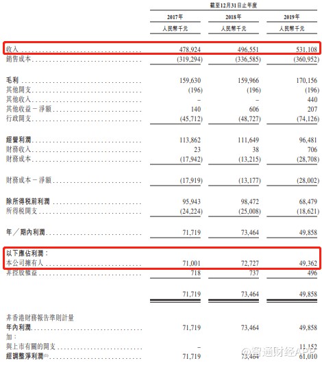然而,宏力医疗的财务“基本功”并未有想象中那么扎实。招股书显示,宏力医疗的绝大部分收入均来自提供治疗及综合医疗服务以及在河南宏力医院的药品销售。2017-2019的近三年内,宏力医疗的收入分别为4.79亿元(人民币,单位下同)、4.97亿元和5.31亿元,连年递增。同期,公司归母净利润分别为人民币7170万元、7350万元和4990万元,利润下滑较为明显。在利润暴跌的同时,期内公司的毛利率亦由2017年的约33.3%逐步降至2019年的约32.0%。