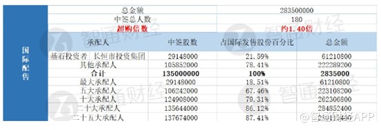 从比例上看,国际配售中签人数为180人,认购倍数为约1.4倍,其中基石投资者就拿走了国际配售两成,前二十五大承配人拿走国际配售87.41%,国际配售部分高度集中。