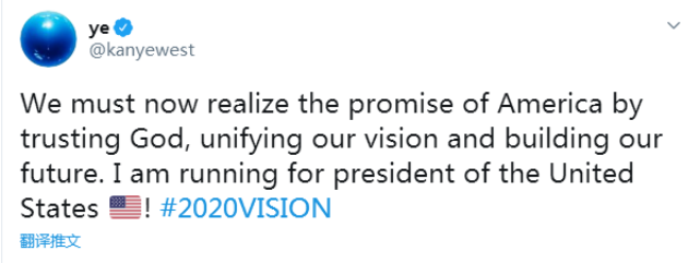 他在推特上宣称:“我们现在必须通过相信上帝、统一看法并共筑未来来实现美国诺言。我要竞选美国总统。”
