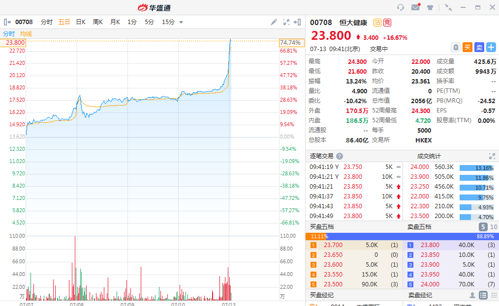 新浪港股讯 7月13日消息,恒大健康涨幅扩大至16%,市值突破2000亿港元大关,最新市值2056亿港元,本月暴涨超123%。