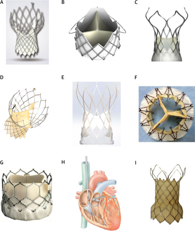 (A) 启明医疗 VenusA valve; (B) 杰成医疗 J-valve; (C) 微创医疗 VitaFlow valve; (D) 启明医疗 合资干膜 Venibri valve; (E) 沛嘉医疗 TaurusOne valve; (F) 赛诺医疗 二尖瓣膜 AccuFit valve; (G) 印度Meril生命科学 MyVal valve; (H) 二尖瓣环扎导管 mitral loop cerclage system; (I) 启明医疗 VenusPlus valve (全球首款自膨胀式TPVR)