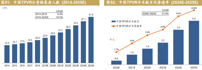 2014年至2018年间, 中国TPVR患者从15,900人增加至20,400人, 预期到2025年将增加至41,000人。预期2020年至2025年, 中国的TPVR渗透率将从1.7%增加到10.8%。