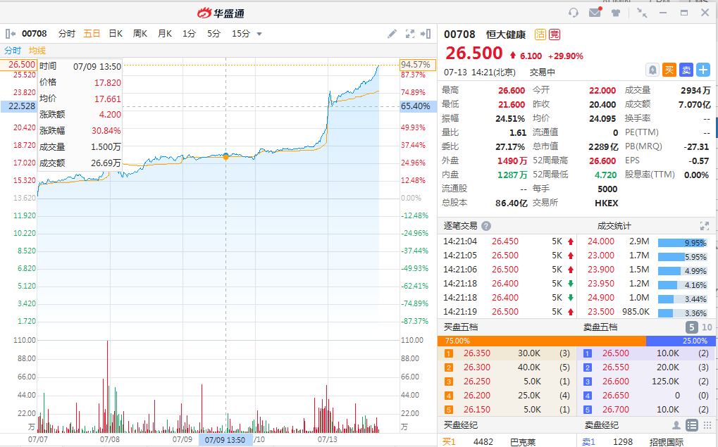 恒大健康大涨30%续刷历史新高 市值突破2200亿港元
