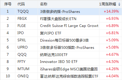 受益于科技股的强势表现,上周纳指再次创出历史新高,3倍做多纳指的TQQQ连续领涨,上周涨幅达到14.39%,相比其他股指ETF有明显的涨幅优势,比如,3倍做多标普500指数的SPXL涨幅仅有5.09%。