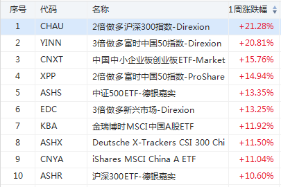 其中,2倍做多沪深300指数的CHAU以21.28%的涨幅位列第一,而富时中国50指数表现稍逊色,3倍做多该指数的YINN上周涨幅20.81%,位列第二。