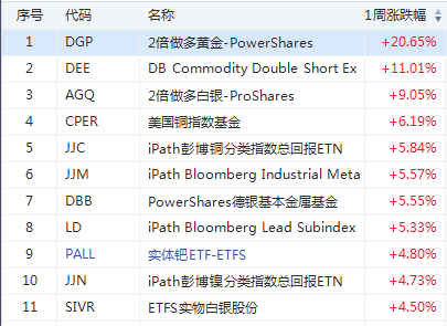 商品ETF中,上周涨幅排名第一的便是2倍做多黄金的DGP,涨幅高达20.65%,而2倍做多白银的AGQ也涨了有9.05%。(DEE停牌已久,涨幅为历史行情)
