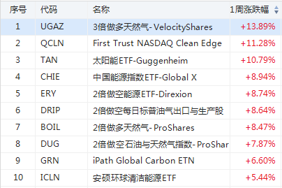 其中,3倍做多天然气的UGAZ上周续涨了近14%,而在此前一周,该ETF就曾以35.33%的涨幅领涨ETF大类。