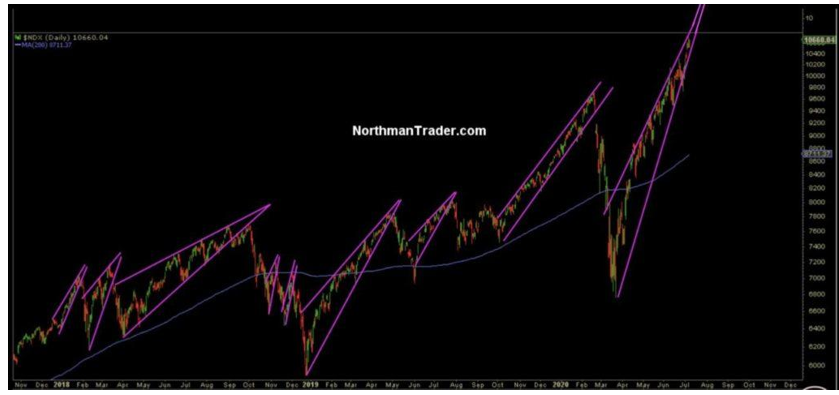 除了该理论预测,技术面也很重要,因为当前的趋势看起来是不可持续的(如上图),下面仍有许多未填补的空白。尽管纳斯达克指数在不断地创下新高,但VIX波动指数仍维持在历史高位附近。