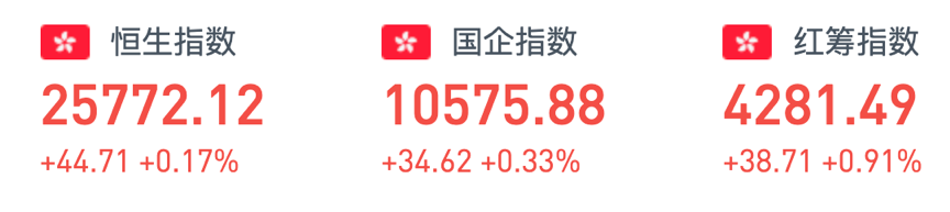 周一,恒生指数收盘上涨44.71点,涨幅为0.17%,报收25772.12点;国企指数收盘上涨34.62点,涨幅为0.33%,报收10575.88点;红筹指数收盘上涨38.71点,涨幅为0.91%,报收4281.49点。