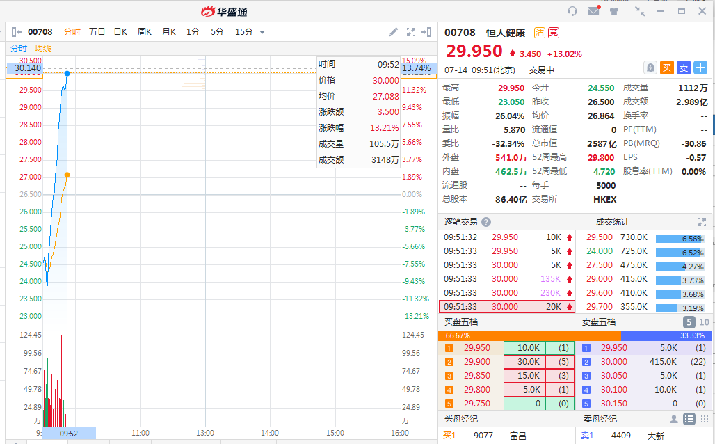 恒大健康转涨大涨13%,此前一度跌近10%。
