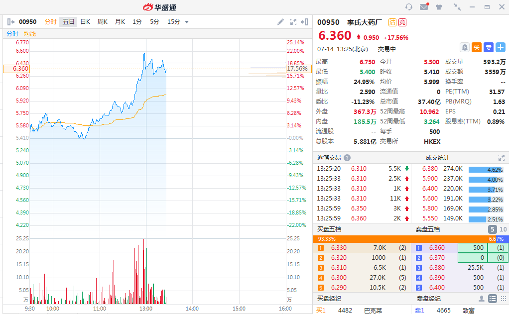 格隆汇7月14日丨李氏大药厂(0950.HK)现报6.36港元,涨幅17.56%,最新总市值37.4亿港元。
