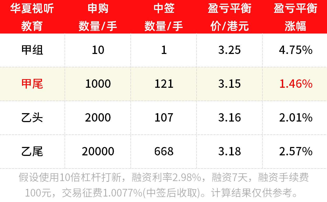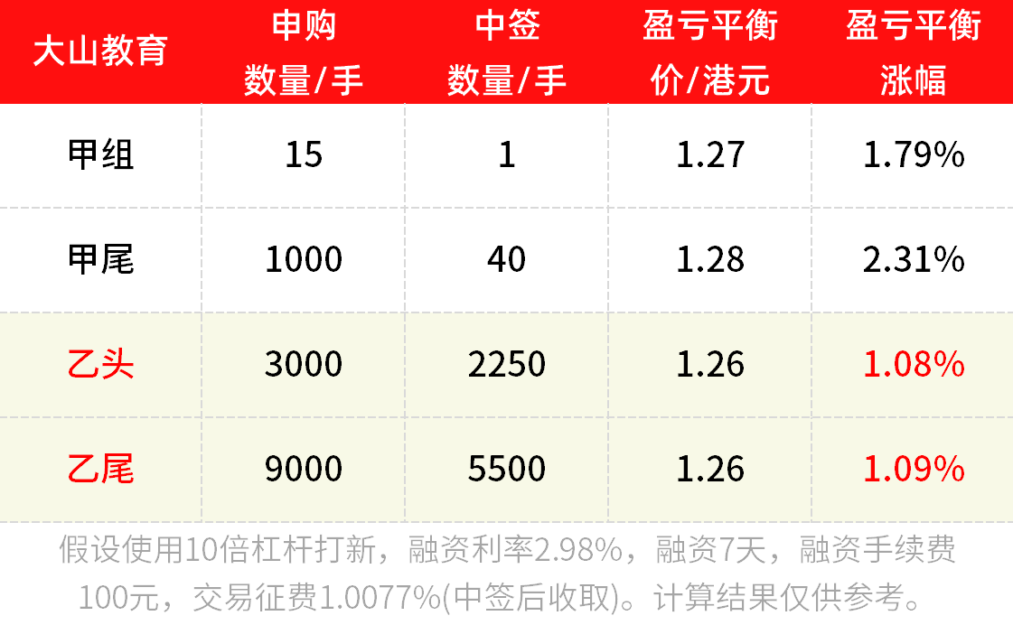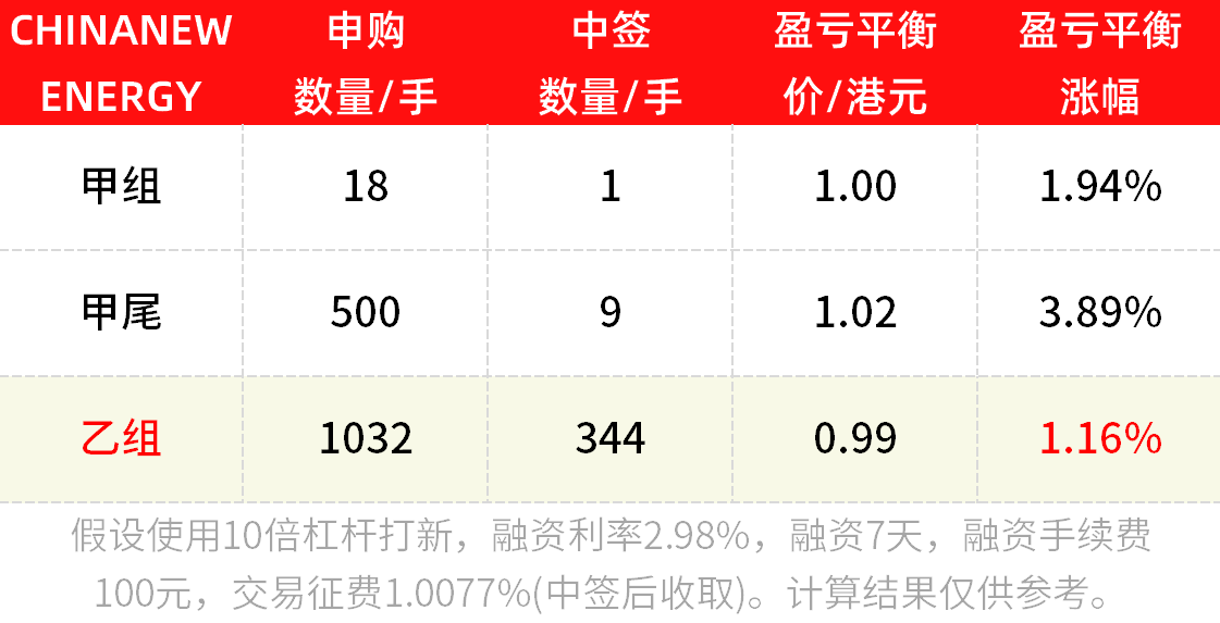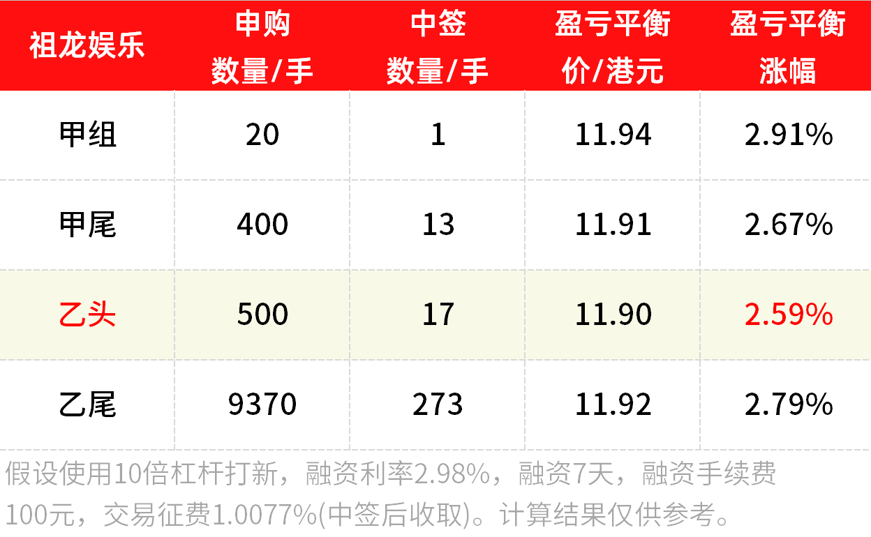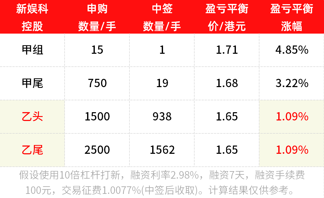 公开发售甲乙组盈亏平衡点差异较大,甲组申购15手即可100%获配一手,但涨幅需要达到4.85%方可获利。对于乙头乙尾,涨幅仅需大于1.09%即可获利。