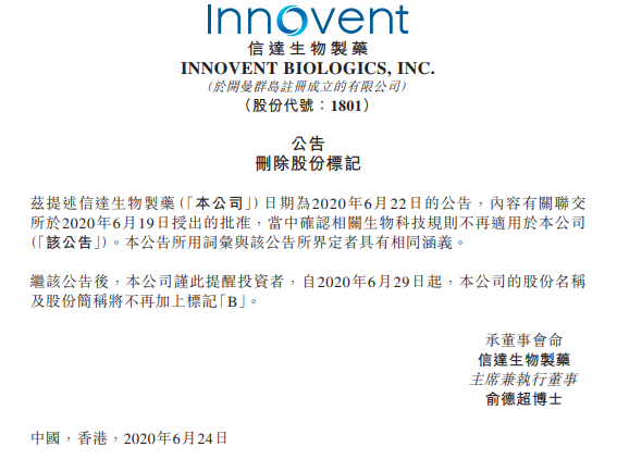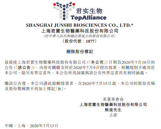 君实生物并不是第一家删除“B”后缀的生物医药B类股。在此之前,信达生物(01801.HK)于6月22日宣布,公司股份名称不再加“B”后缀;2019年7月1日,百济神州(06160.HK)删除后缀“B”。君实生物删除“B”后缀后,截至目前带有“B”后缀的生物医药公司共计14家。