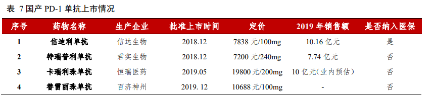 百济神州、君实生物、信达生物作为领头羊能够去B,实际上也与其PD-1单抗的出色销售表现有关。目前国内共批准上市 7 款 PD-1/PD-L1 单抗产品,其中有 4 款为国产,分别为信达生物的信迪利单抗、君实生物的特瑞普利单抗、恒瑞医药的卡瑞丽珠单抗以及百济神州的替雷利珠单抗。2019 年君实、信达 PD-1 单抗销售额达 7.7、10 亿元,百济神州的替雷利珠单抗临床疗效优异,对经典型霍奇金淋巴瘤期完全缓解率达 61.40%,且在肺癌等大瘤种进度国内领先。