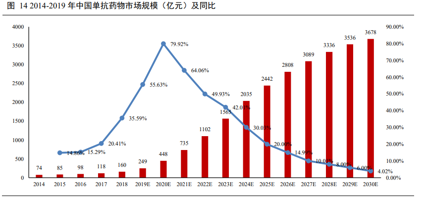 中国的单克隆抗体药物市场还处于起步阶段。2018 年中国单抗市场仅占总生物药市场的 6.1%,单克隆抗体药物在中国的种类较少、覆盖率较低。而随着国内需求端及支付能力的持续提升,医保覆盖面及上市品种的持续扩大,我国未来单抗市场将迎来快速发展时期。依据弗若斯特沙利文数据,预计到 2023 年,我国市场将增长到 1,565 亿元人民币,2018 年到 2023 年的年复合增长率为 57.9%。到 2030年,中国单克隆抗体市场规模将增长到 3,678 亿元,2023 年到 2030 年的年复合增长率为13.0%。