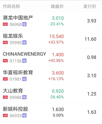 华盛资讯7月14日讯,6只新股开启暗盘交易 ,截至16:22,祖龙娱乐涨33.97%,报15.4港元,最新市值125.2亿港元。CHINA NEWENERGY涨42.86%,报1.4港元,华夏视听教育涨16.13%,报3.6港元。