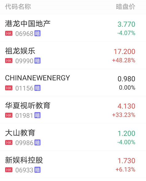 祖龙娱乐暗盘收涨48.28%,一手账面收益5600港元;华夏视听教育暗盘收涨33.23%,一手账面收益1030港元;新娱科控股收涨6.13%,一手账面收益200港元;大山教育收盘跌幅缩小至4%;CHINA NEWENERGY高开平收;港龙中国地产收跌4.07%。6只新股将于明日挂牌港交所。