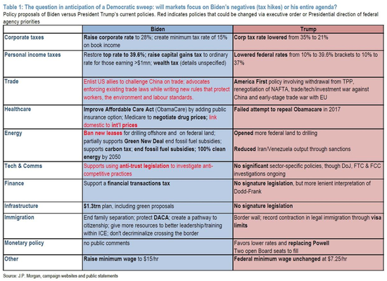 但小摩承认,拜登当选还是存在一定的风险,因为“市场关注的是大选前后几周有形的负面因素(企业税上涨),而非更加虚无飘渺的积极因素(外交政策)。”因此,小摩认为有必要进行风险对冲。