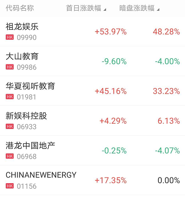另外5只新股涨跌互现,华夏视听教育涨45.16%,新娱科控股涨4.29%,CHINA NEWENERGY涨17.35%,大山教育与港龙中国地产破发。