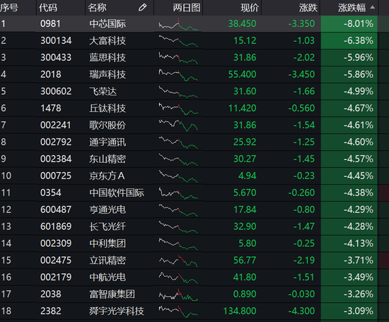 华为概念股集体走低,其中,中芯国际大跌8%,瑞声科技跌6%,丘钛科技、中国软件国际跌超4%。