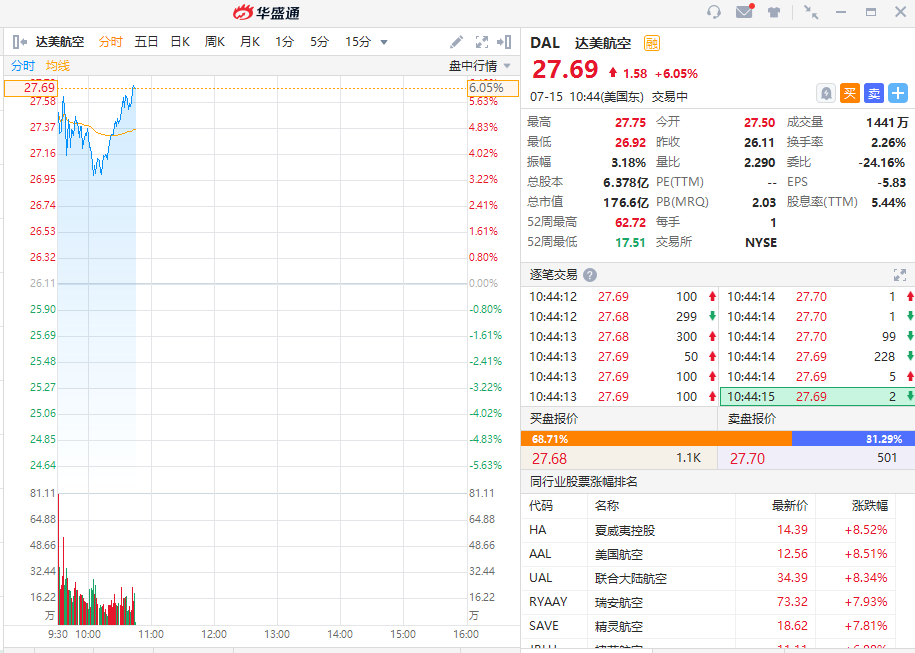 华盛资讯7月15日消息,美国航空股走高。美国联合航空(UAL.O)、美国航空集团(AAL.O)涨超8%,达美航空(DAL.N)涨超6%,西南航空(LUV.N)涨超5%。