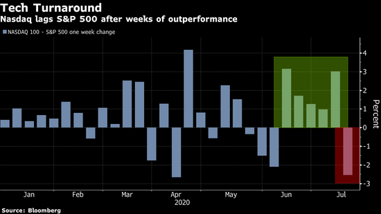 标普500指数周三连续第二日上涨,试探了该指数在投资者因担心疫情而再度涌入科技股之前的6月8日收盘水平。纳斯达克100指数经过五周跑赢标普500指数后,这项主要汇集超大盘科技股的指数开始落后,而且相对于标普500指数的表现势创4月以来最差的一周,以及过去五年来第四差的一周。