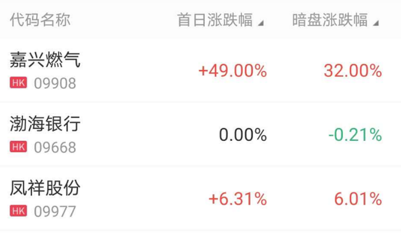在昨日暗盘交易中,嘉兴燃气收涨32%;凤祥股份收涨6%;渤海银行收跌0.21%。