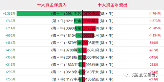 好仓(认购证及牛证)方面,有6388万、749万港元资金分别净流入中芯国际、比亚迪部署造多,而有千万港元资金净流出腾讯、阿里套现。
