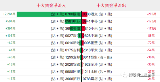 淡仓(认沽证及熊证)方面,腾讯相关淡仓单日录得2281万资金净流入部署;港交所相关淡仓也见少量资金净流出止损。