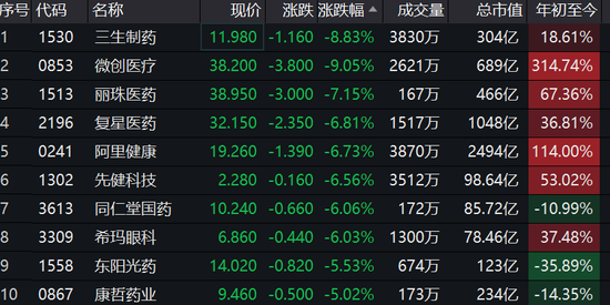 新浪港股讯 7月16日消息,医药股上演估值杀,君实生物、康诺希生物跌超10%,基石药业、信达药业跌超9%,复星医药跌超8%,阿里健康(00241.HK)跌超7%。