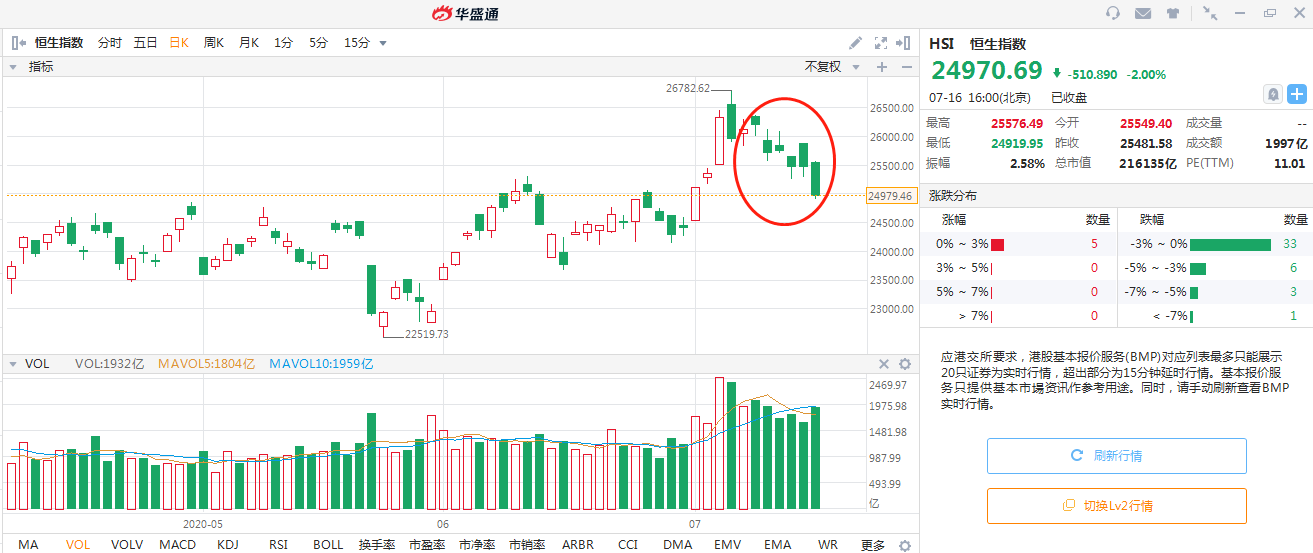 7月16日,恒生指数下跌2%,尽管以单日表现来算并不算跌幅巨大,但这已经是恒指连续6个交易日收阴线。自2020年7月7日恒生指数创下新冠疫情大跌以来的新高26782点以来,已经累计下跌超过1800点。