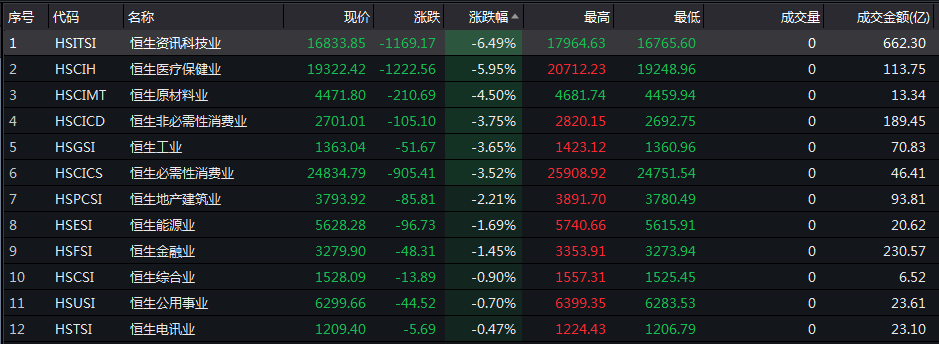 而纵观恒生综合行业指数,全线呈现下跌,其中资讯科技业和医疗保健业下跌幅度最大,都有近6%;而电讯业、公用事业以及金融业等下跌幅度较小。
